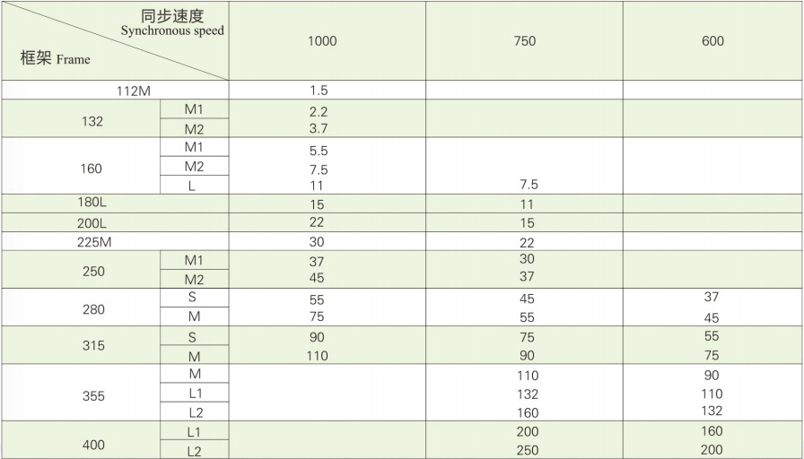 The range of rated output and synchronous speed for the basic duty type (S,40%)are shown in tablel. (cage motor manufacturing,specifications in thick-line block)Table(2)