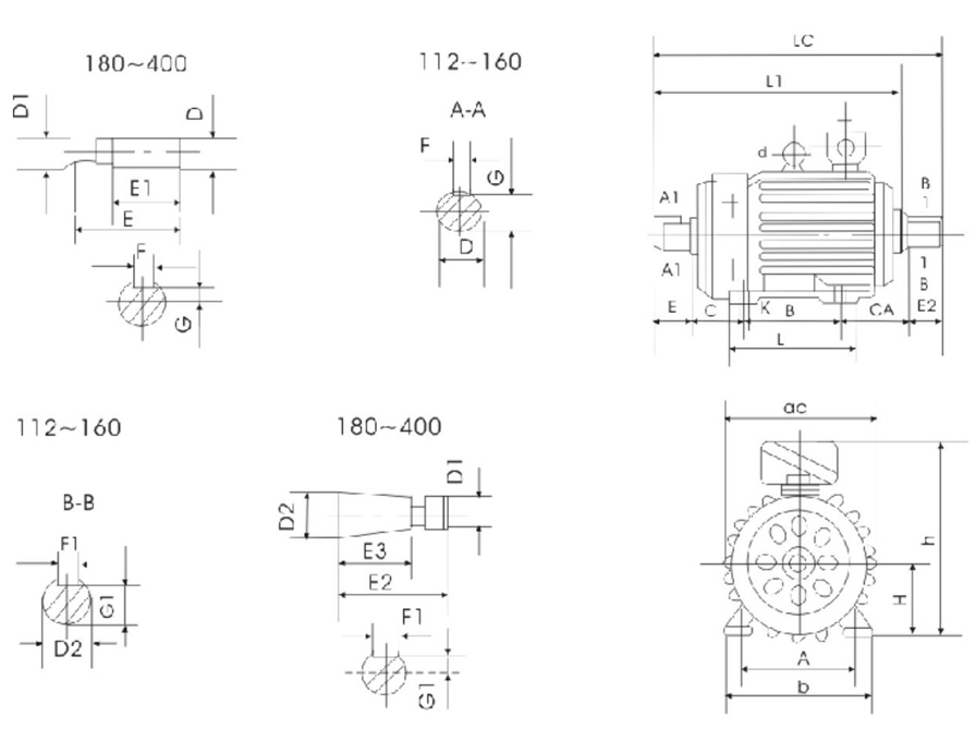 For frame size 112132,natural cooling,(IC0041),for frame size 160355,built-in fan cooling (ICO141). For frame size 400,external-fan cooling with internal circulating ventilation,(IC0151)