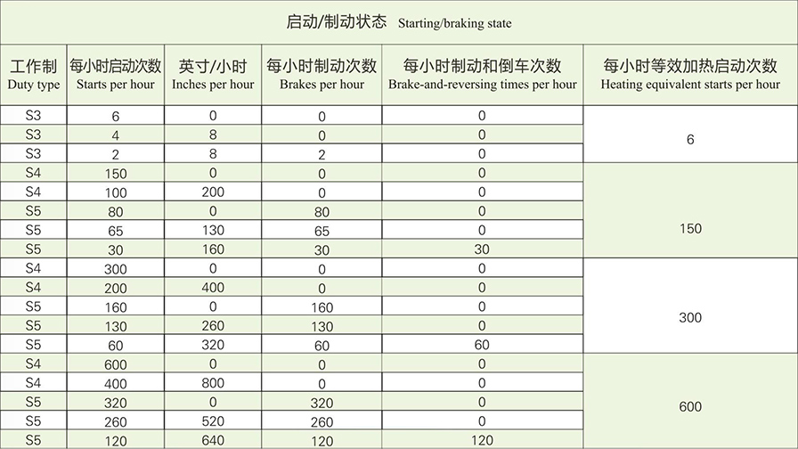 Inching (the final speed being not exceeding 25%of rated speed)four times is equivalent to starting once. Electrical braking(being braked to 1/3 rated speed)once is equivalent to 0.8 times a start.